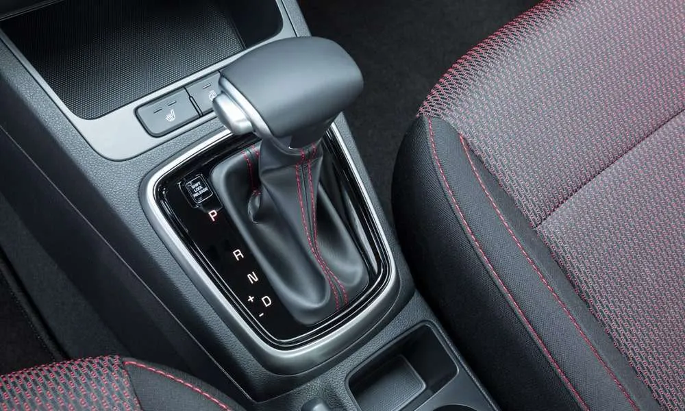 | Селектор трансмиссии и рулевое колесо с красной прострочкой |